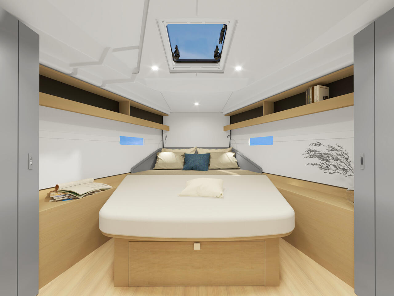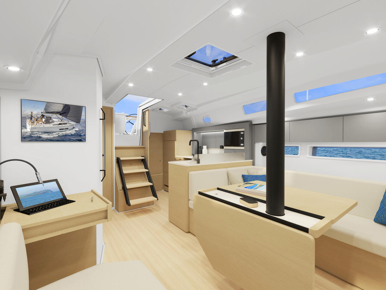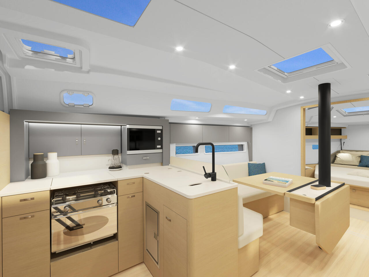 Das ST-Line-Interieurpaket bietet schwarze Armaturen, Leuchten, Maststütze und Handläufe. Die Pantry-Ausstattung umfasst einen 2-Flammen-Gasherd mit Ofen und einen 12-V-Kühlschrank mit ca. 135 l. Deck und Elvström SPS-Segel bestehen aus Recyclingmaterialien; optional sind Solarpaneele, Brennstoffzelle und elektrischer Antrieb mit bis zu 55 sm Reichweite.