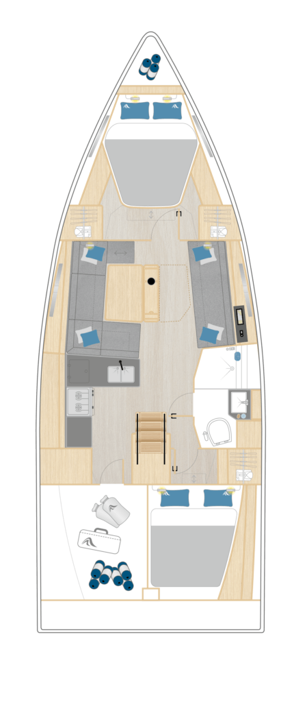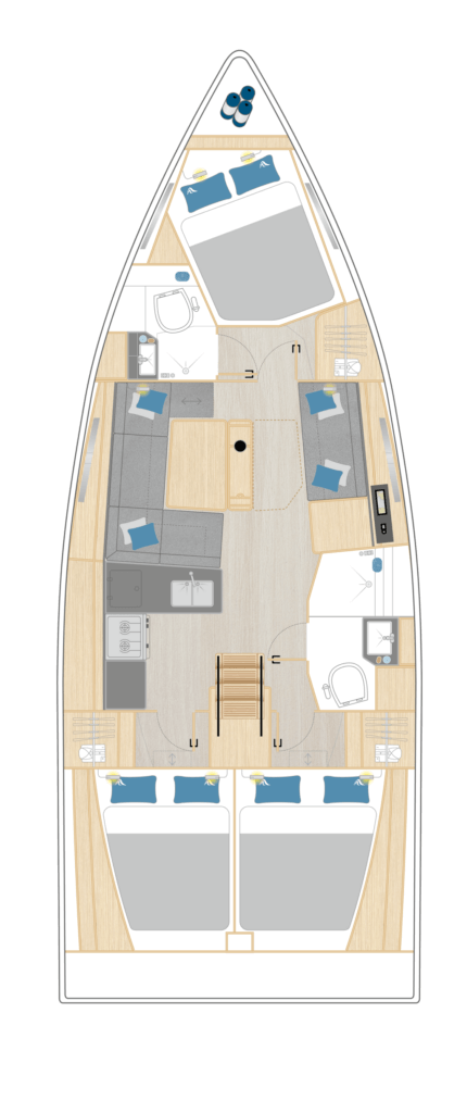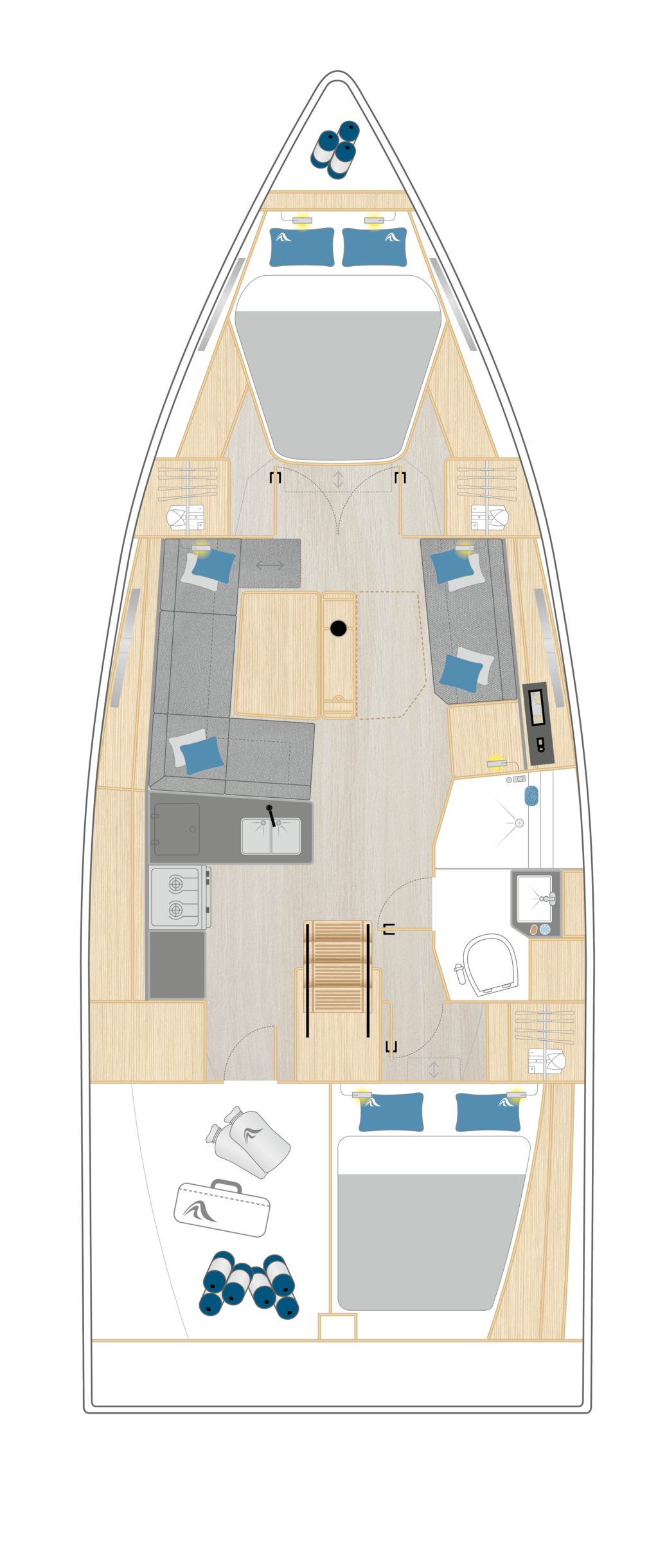 Es gibt Optionen für 2 oder 3 Kabinen und 2 oder 3 Badezimmer. Das Standard-Layout (A1/B1/C1) umfasst eine Eignerkabine mit Insel-Doppelbett, einen Salon mit großem Essbereich, eine L-Pantry und eine Nasszelle mit separater Dusche sowie eine Achterkabine.