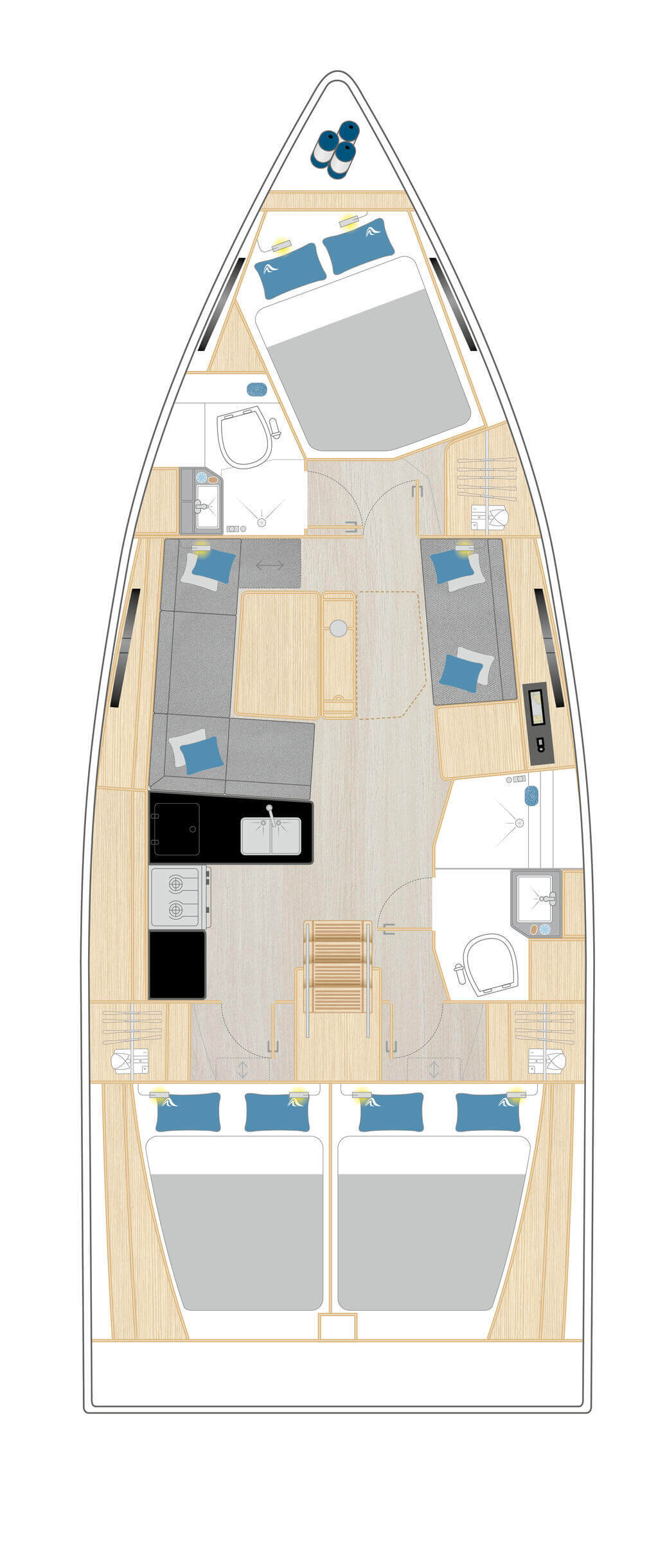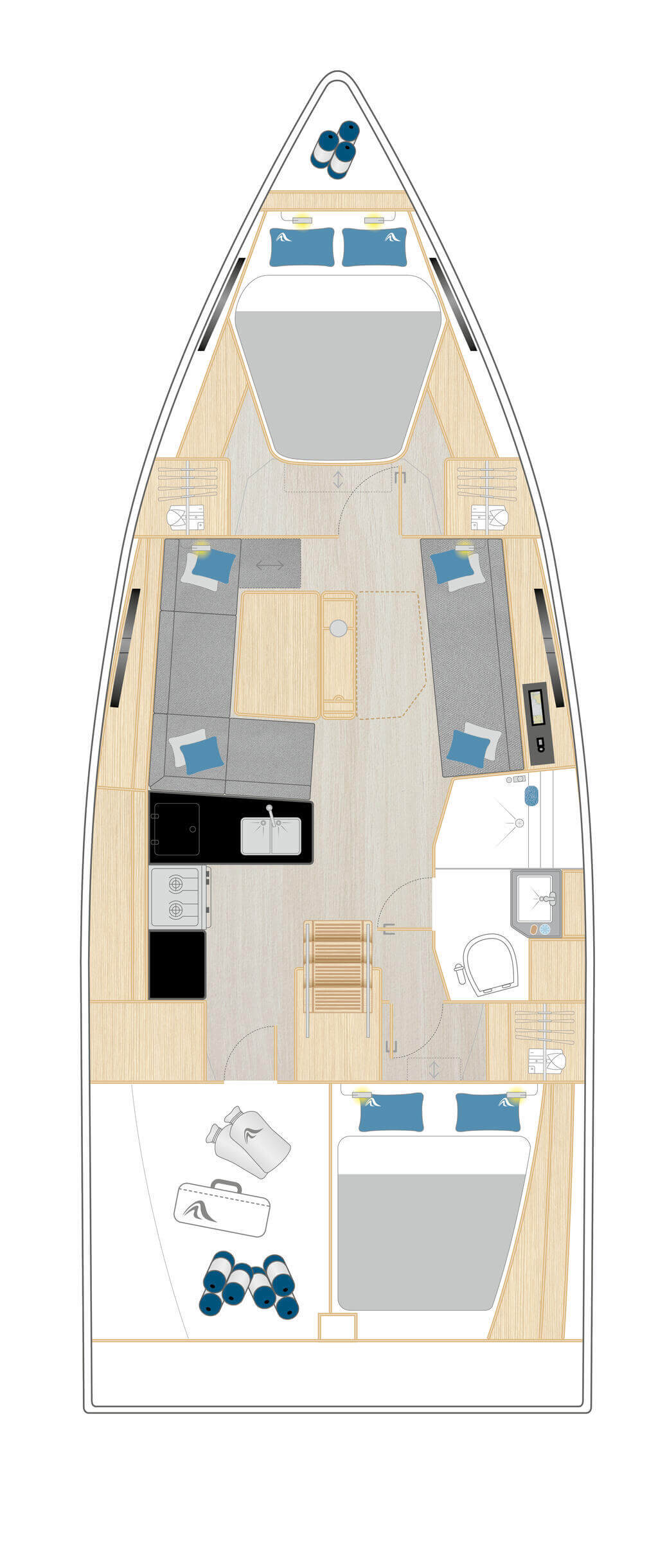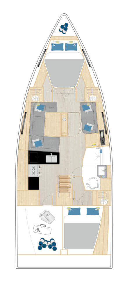 Das Interieur bietet verschiedene Layouts mit einer Eignerkabine im Vorschiff und variablen Achterkabinen. Der Salon bietet Platz für bis zu acht Personen an einem großen Tisch, der in zwei Ausführungen erhältlich ist. Die großzügige L-Pantry umfasst ein Doppelwaschbecken aus Edelstahl, einen 2-Flammen-Gasherd mit Ofen und einen 12-V-Kühlschrank (135 l).