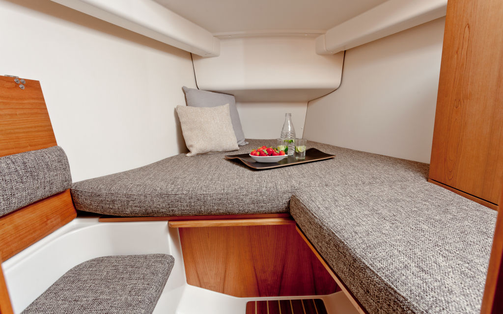 Im Vorschiff stehen zwei Varianten zur Wahl: Entweder mit offenem Schott und großer Doppelkoje oder mit geschlossenem Schott, extra Schrank, kleinem Sitz und einer variablen Doppelkoje.