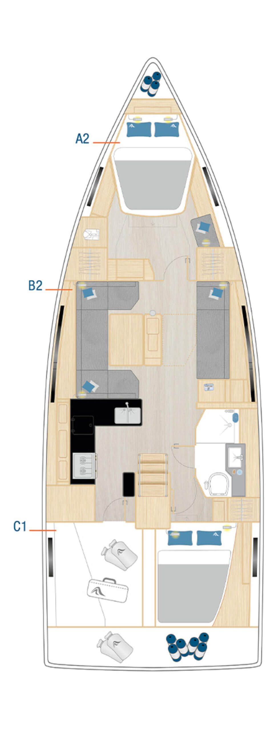 Das geräumige Interieur mit bis zu 10 zu öffnenden Luken und Fenstern schafft eine helle und luftige Atmosphäre unter Deck. Segeln wird zum Genuss dank des durchdachten Cockpits, des sportlichen Riggs und optionalen elektrischen Winschen.