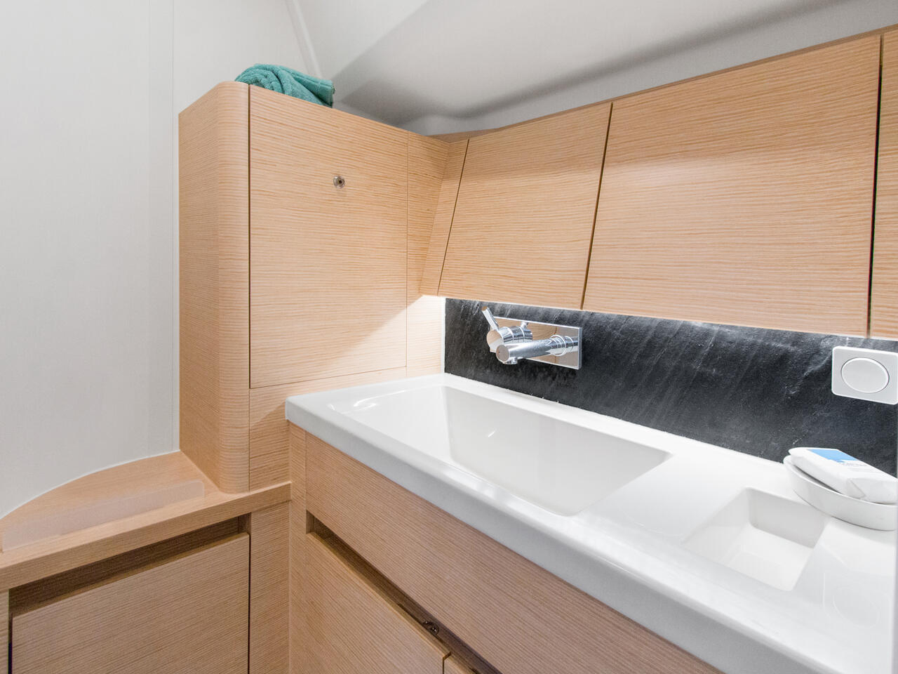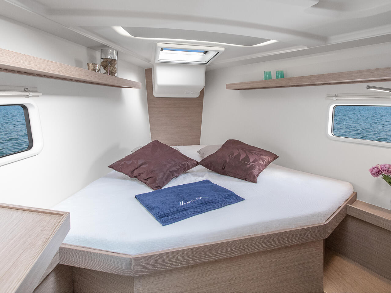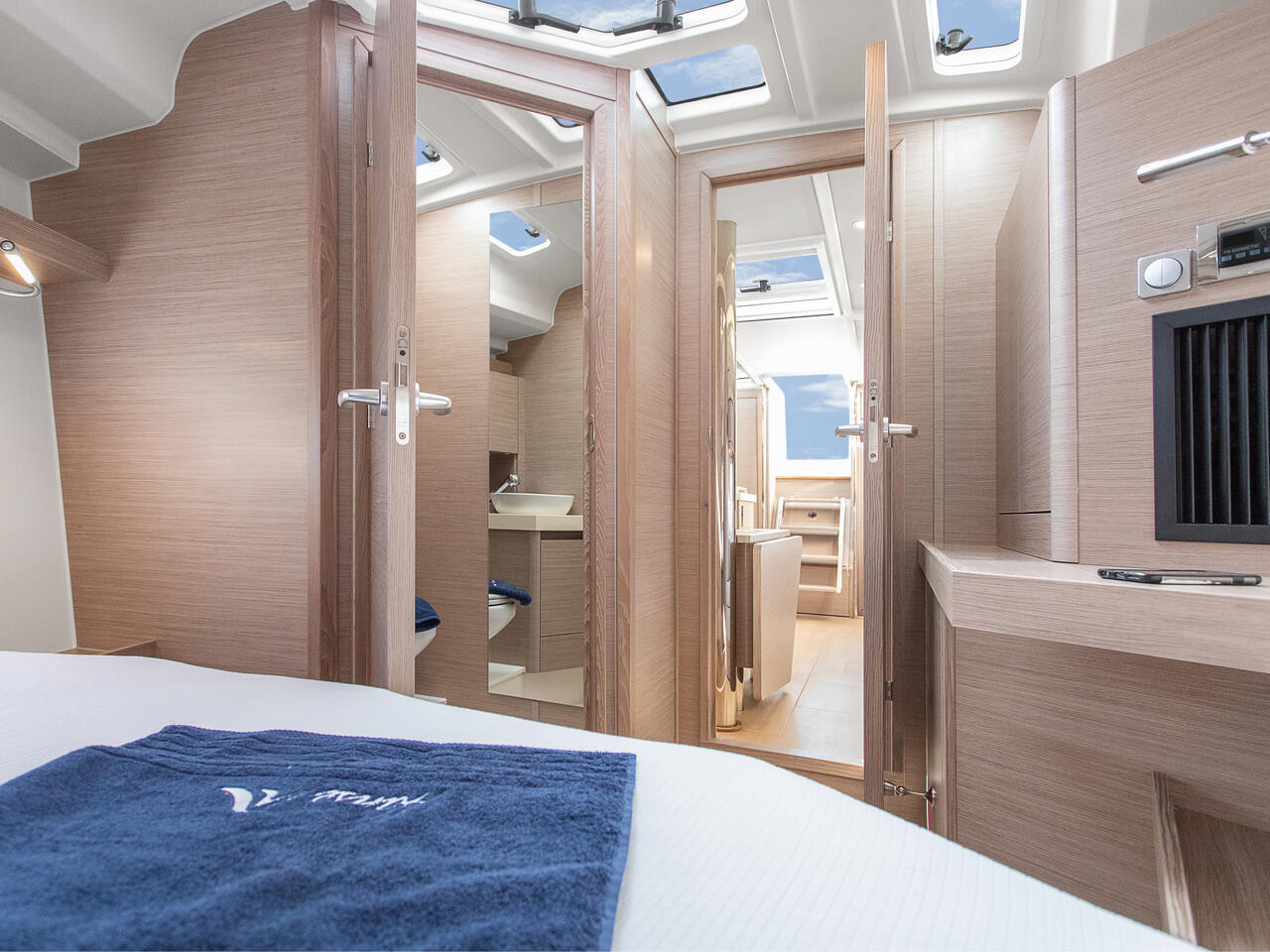 Die Eignerkabine verfügt über ein komfortables Inselbett, viel Stauraum und optional ein eigenes Bad mit Dusche. Der Salon ist mit zwei Sitzgruppen, einem klappbaren Tisch und wahlweise einer langen oder kurzen Pantry ausgestattet. Die Achterkabinen können je nach Layout als Schlaf- oder Stauraum genutzt werden – mit zwei oder drei Kabinen.