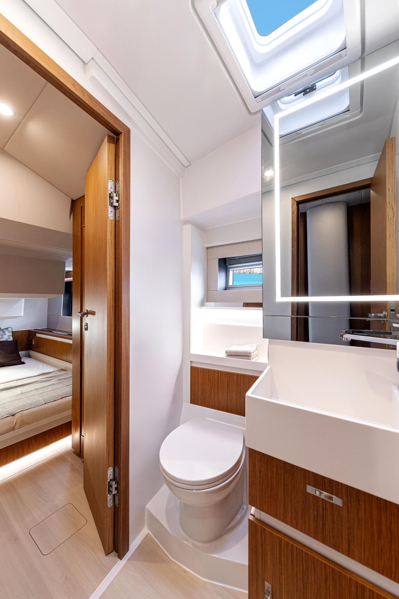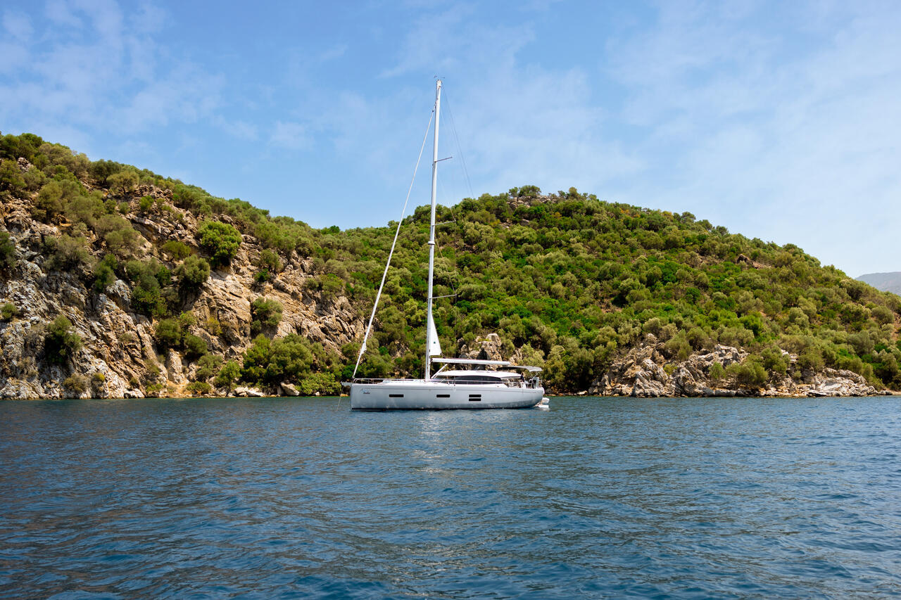 Zur Standardausstattung gehören ein Bugstrahlruder (24 V, Tunnel), ein Diesel-Saildrive mit 3-Blatt-Faltpropeller, ein 12-V/230-V-System und ein AGM-Batteriepaket (1× 90 Ah + 4× 160 Ah).