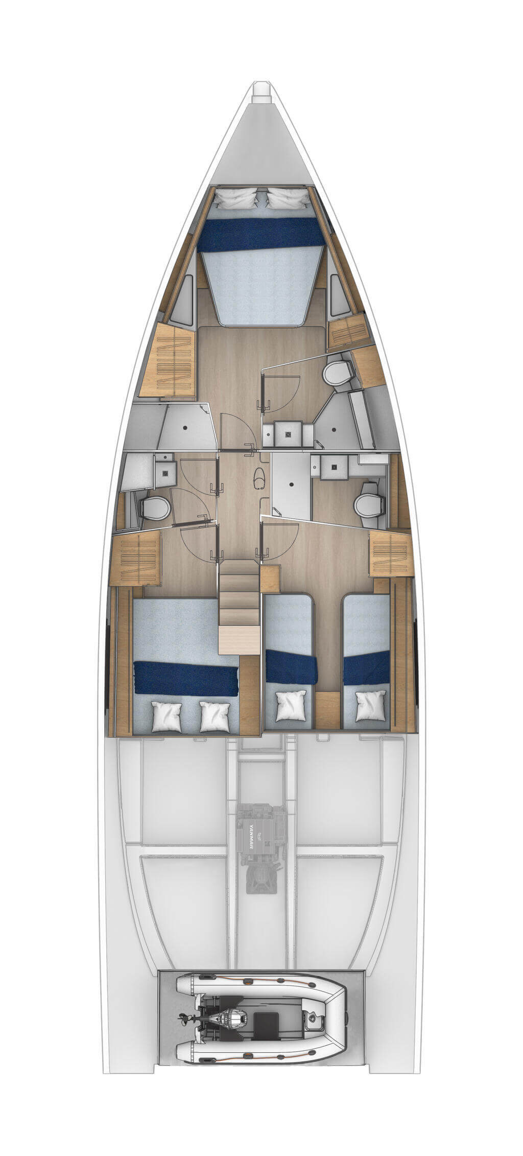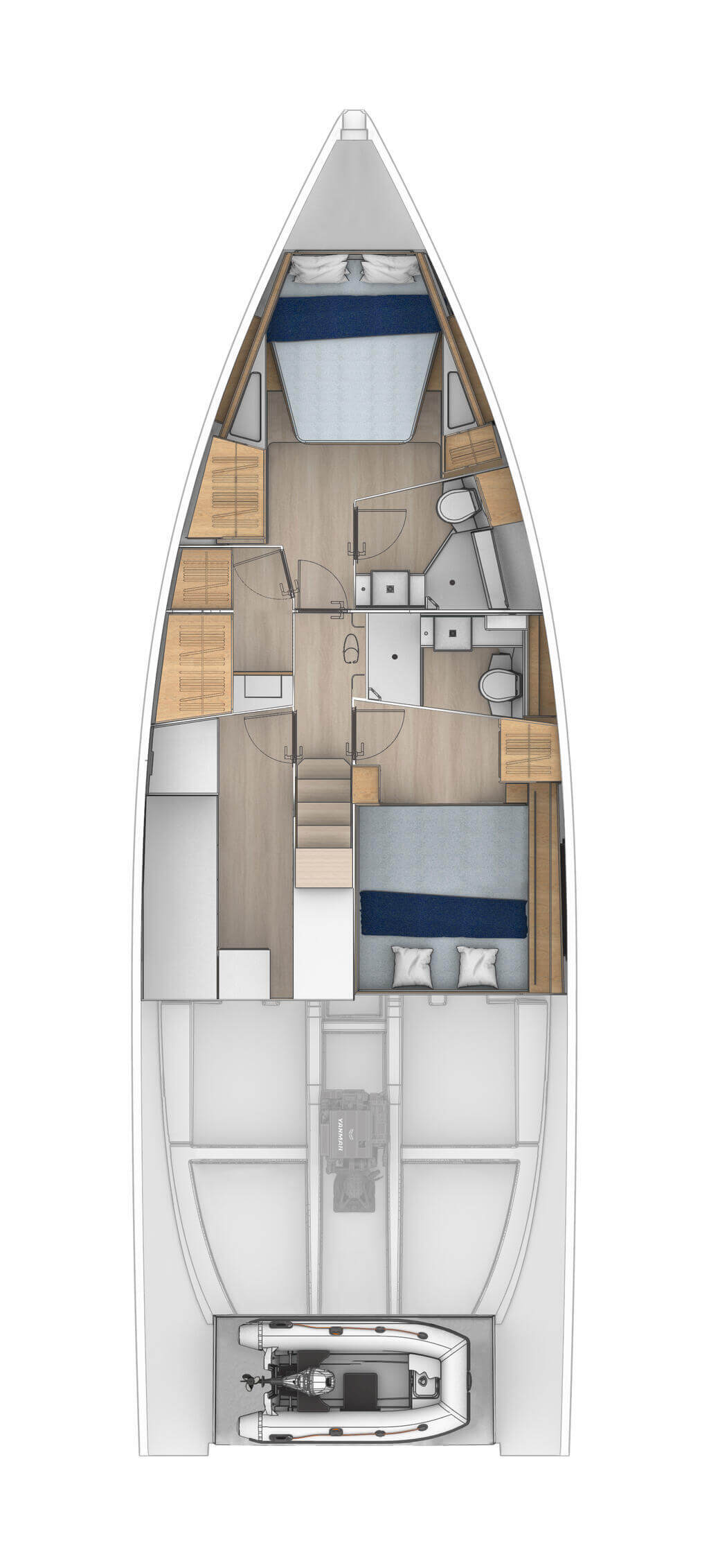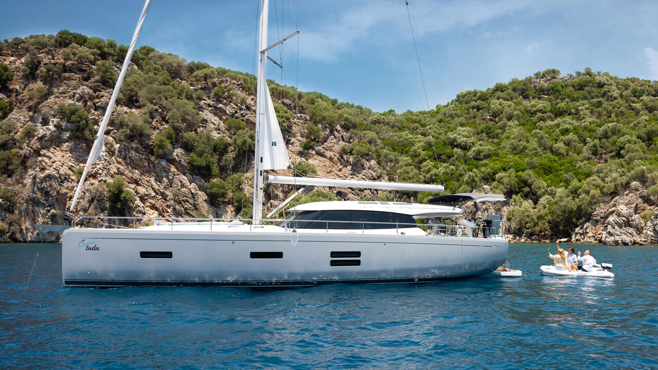 Die Yacht verfügt über eine Dinghy-Garage mit Zugang vom Deck. Das Moody Smart Tender System ist optional und funktioniert nur mit automatischem Ausklappen der Badeplattform.