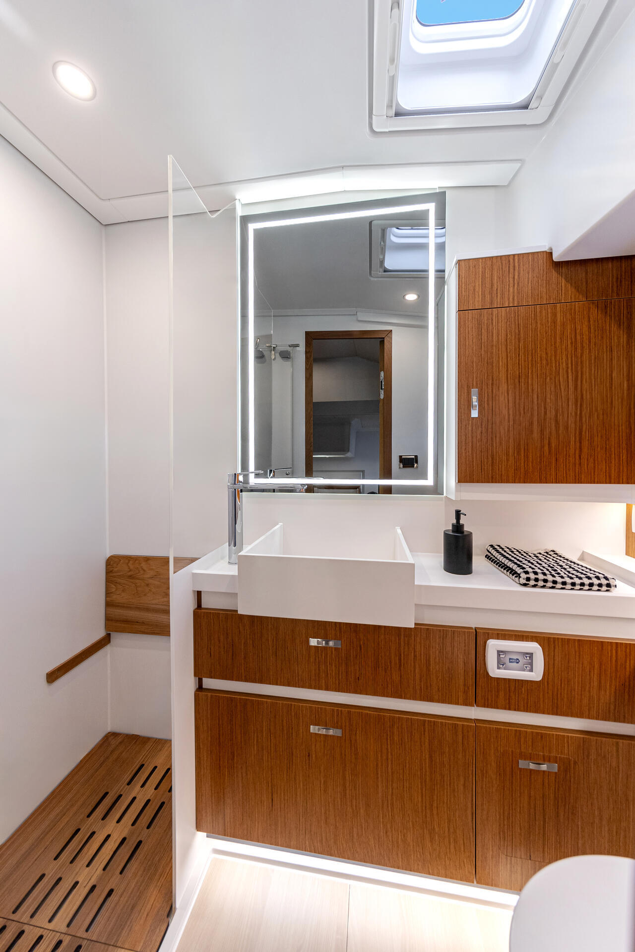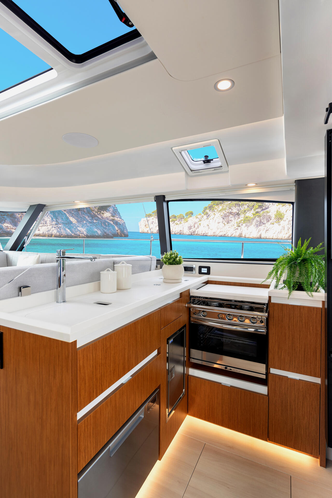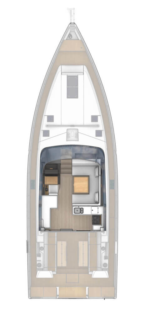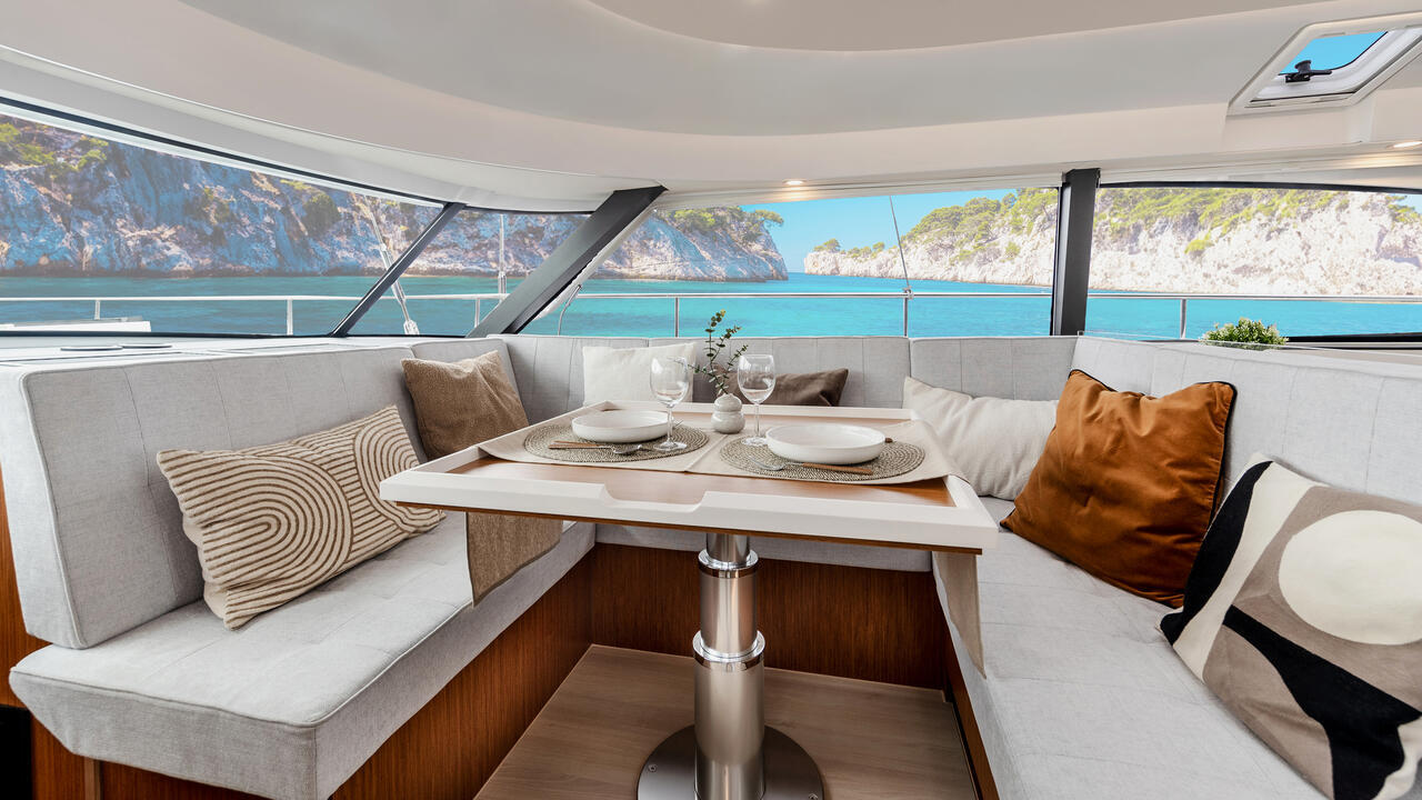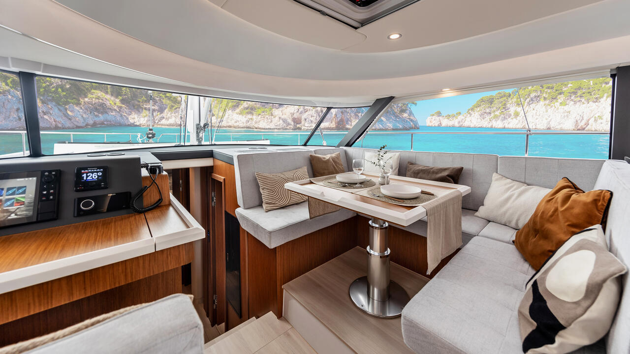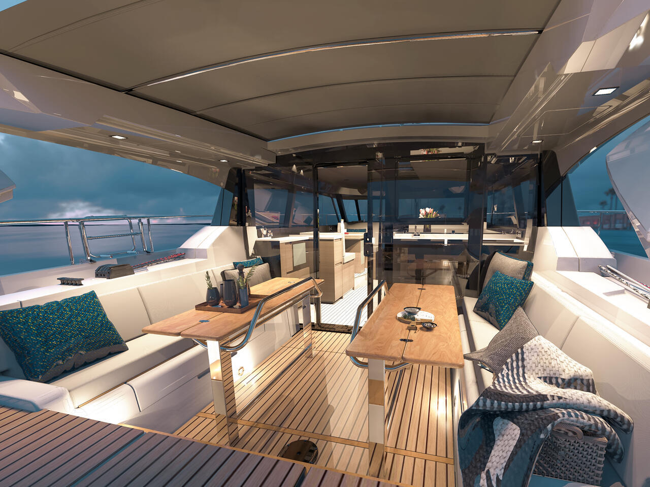 Der Decksalon bietet Panoramascheiben aus Sicherheitsglas, die eine 360-Grad-Rundumsicht ermöglichen. Es gibt eine Sitzgruppe mit Tisch, einen optionalen Steuerstand und eine L-Pantry mit Gasherd und Arbeitsfläche. Optional sind Geschirrspülmaschine, Kühlschrank und Mikrowellenherd erhältlich. Das Ein-Ebenen-Konzept verbindet Pantry, Salon und Cockpit.
