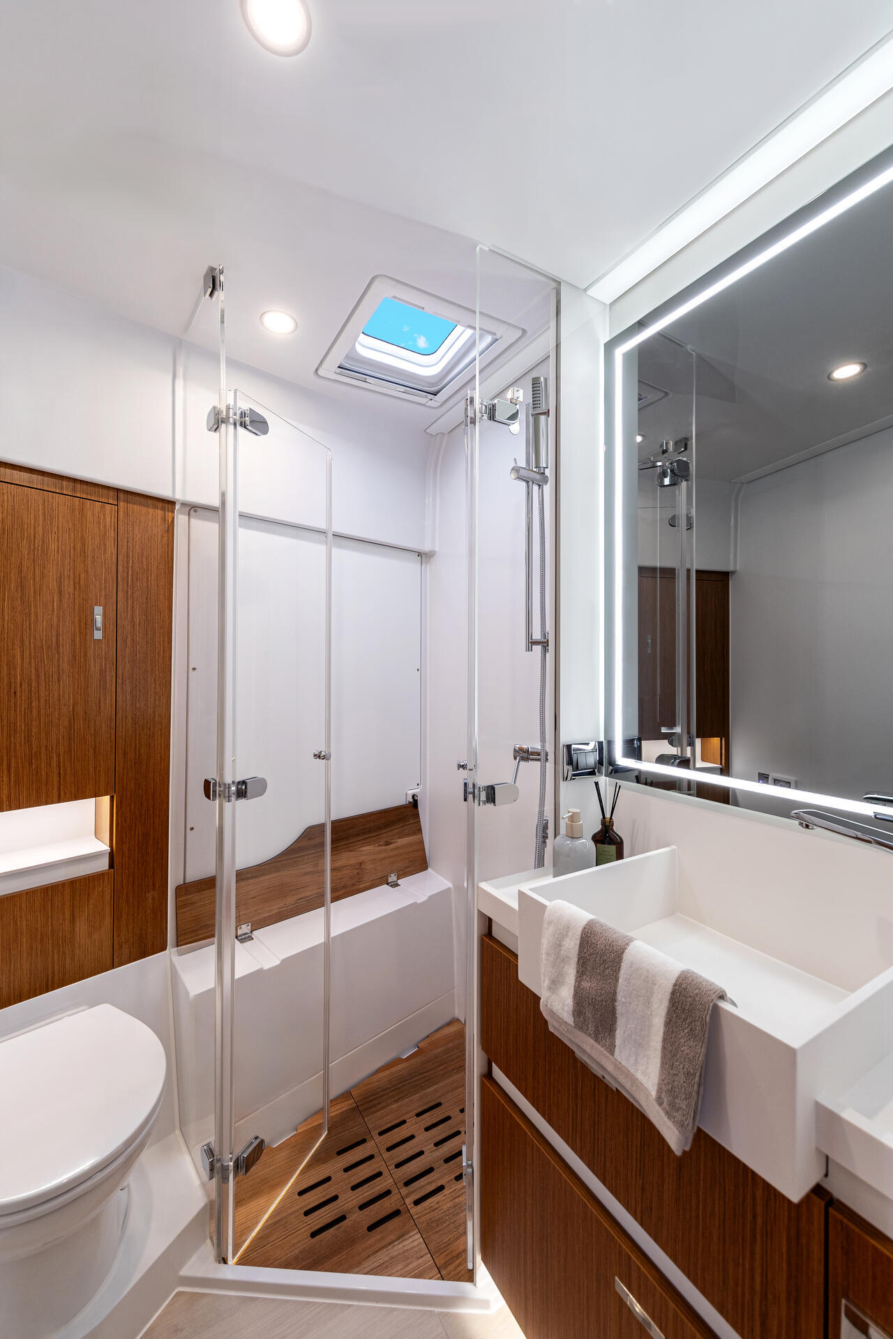 Durch die Überlappung des Deckssalons mit der Achterkabine bietet die Moody DS48 rund 25 Prozent mehr Innenraum – wie sonst auf einer 58-Fuß-Yacht. Es gibt drei Kabinen und bis zu drei Bäder mit separater Dusche. Die dritte Kabine kann auch als Multifunktionsraum genutzt werden. Viel natürliches Licht und eine gute Durchlüftung sorgen für eine angenehme Atmosphäre.