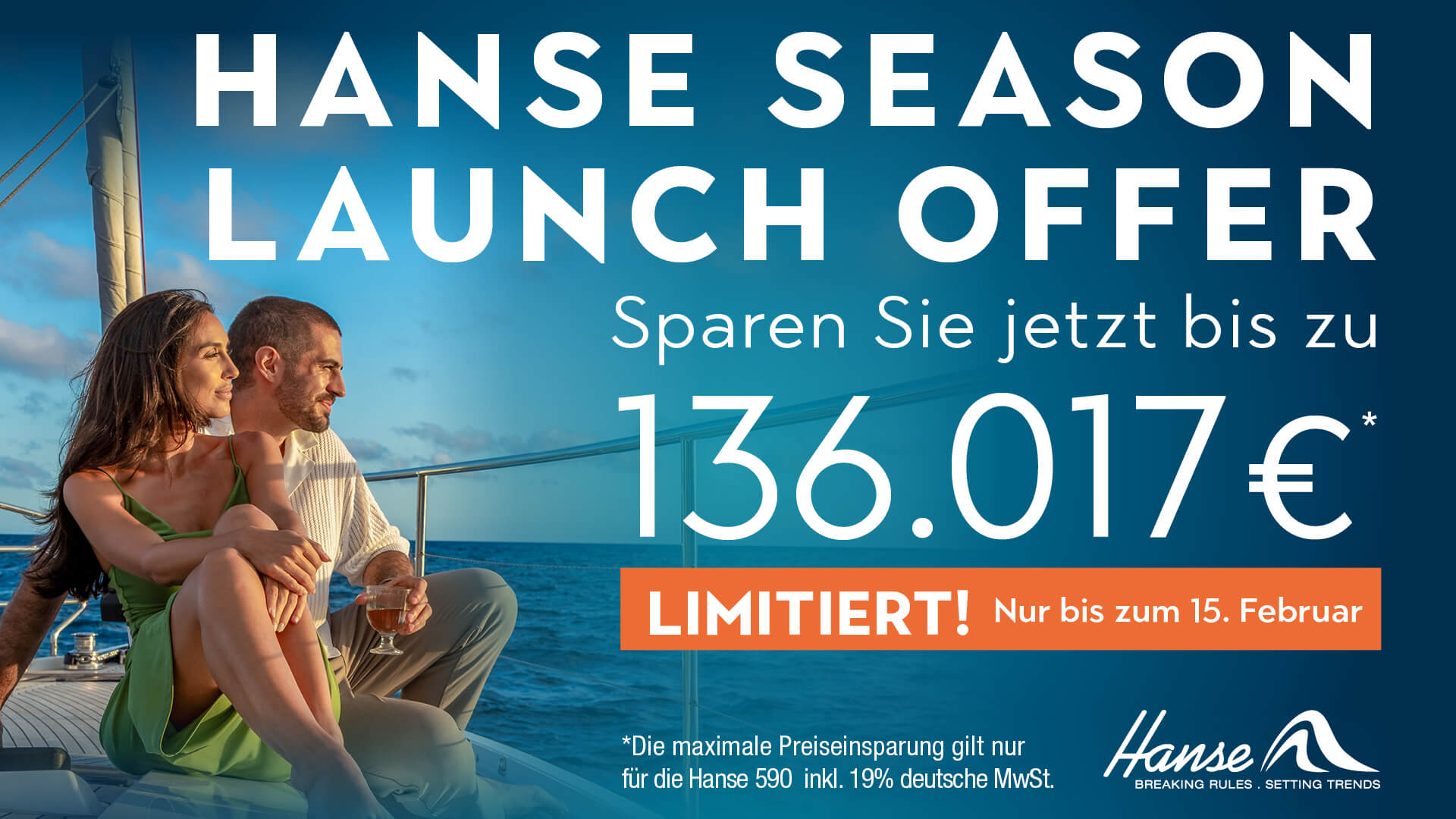 * Der maximale Preisvorteil gilt für die Hanse 590 bis zum 15. Februar 2026. Alle Rabatte enthalten 19 % Mehrwertsteuer. Nicht kombinierbar mit anderen Rabatten oder Vergünstigungen. Irrtum vorbehalten.